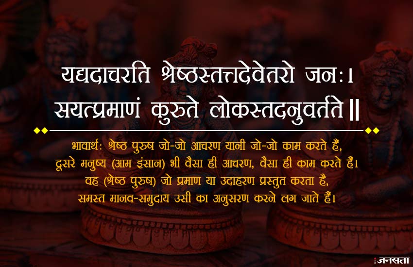 भावार्थः श्रेष्ठ पुरुष जो-जो आचरण यानी जो-जो काम करते हैं, दूसरे मनुष्य (आम इंसान) भी वैसा ही आचरण, वैसा ही काम करते हैं। वह (श्रेष्ठ पुरुष) जो प्रमाण या उदाहरण प्रस्तुत करता है, समस्त मानव-समुदाय उसी का अनुसरण करने लग जाते हैं।