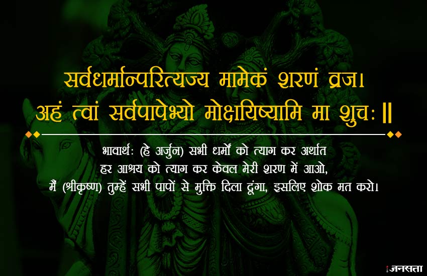 भावार्थः (हे अर्जुन) सभी धर्मों को त्याग कर अर्थात हर आश्रय को त्याग कर केवल मेरी शरण में आओ, मैं (श्रीकृष्ण) तुम्हें सभी पापों से मुक्ति दिला दूंगा, इसलिए शोक मत करो।