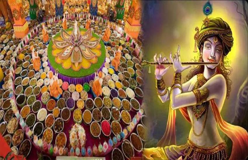 भगवान श्रीकृष्ण के भोग के संबंध में आई एक कथा के अनुसार माता यशोदा श्रीकृष्ण को एक दिन में आठ प्रहर भोजन कराती थी। एक बार इंद्र के प्रकोप से जब सारे ब्रज को बचाने के लिए भगवान श्रीकृष्ण ने गोवर्धन पर्वत को उठाया था। तब लगातार सात दोनों तक भगवान ने अन्न और जल ग्रहण नहीं किया था। आठवें दिन जब भगवान ने देखा कि अब इंद्र की वर्षा बंद हो गई है, तब उन्होंने सारे बृजवासियों को गोवर्धन पर्वत नीचे उतर जाने के लिए कहा। तब दिन में आठ प्रहर भोजन करने वाले श्रीकृष्ण को लगातार सात दिनों तक भूखा रहना पड़ा। साथ ही उनके ब्रजवासियों और माता यशोदा के लिए यह बहुत ही कष्टकारक साबित हुआ।