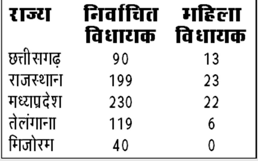 इसके लिए दोषी सभी पार्टियां हैं। राजनीतिक दलों ने कम ही महिला उम्मीदवारों को मैदान में उतारा। पुरुष उम्मीदवारों को ‘जिताऊ’ होने के आधार पर तरजीह दी गई, या फिर उन्हीं सीटों पर महिला उम्मीदवारों को खड़ा किया जहां पार्टी के जीतने के आसार बहुत ही कम थे। कम महिला विधायक होने का मतलब है महिला मंत्री भी कम होना। मिजोरम में तो कोई महिला विधायक इसलिए भी नहीं है क्योंकि मिजो नेशनल फ्रंट ने एक भी महिला को टिकट नहीं दिया! इसका समाधान आसान है- महिलाओं के लिए विधायिका में कम से कम 33 फीसद आरक्षण हो। यह कोई क्रांतिकारी विचार इसलिए नहीं है, क्योंकि नगर निगमों और पंचायतों के चुनाव में इस तरह के आरक्षण का कानून पहले ही से मौजूद है।