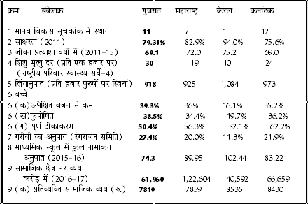 गुजरात सरकार ने गलती यह की कि वितरण में न्याय के तकाजे को दरकिनार रखा। हम गुजरात की तुलना इसके साथ ही अलग बने राज्य महाराष्ट्र और कर्नाटक तथा तमिलनाडु जैसे अन्य अग्रणी राज्यों से कर सकते हैं। मानव विकास सूचकांक में उत्तम स्थान हासिल करने वाले केरल से भी तुलना की जा सकती है। (देखें तालिका)