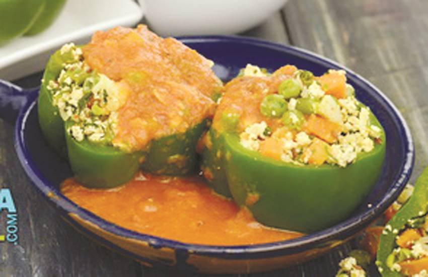 शिमला मिर्च में आलू-पनीर का तैयार मिश्रण ठीक से दबा कर भरें और ऊपर से चाहें तो घिसा हुआ चीज या चीज स्लाइस लगा कर कड़ाही में उसी तरह पकने को रखें जैसे टमाटरों को पकने के लिए रखा था। चाहें तो इन्हें अवन में भी पका सकते हैं। पंद्रह-बीस मिनट में भरवां शिमला मिर्च पक कर तैयार हो जाएंगी। इनके पकने की पहचान यह है कि इसके छिलके की पतली परत जगह-जगह से निकलने लगती है।