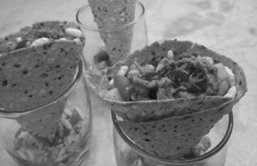 निथरी हुई सब्जियों में उबला हुआ आलू, हरी मिर्च, हरा धनिया, अदरक को बारीक काट कर मिलाएं। उसी में उबले हुए राजमा को भी मिला दें। फिर इसमें इमली की चटनी, चाट मसाला, भुना हुआ जीरा और हल्का काला नमक मिला लें। इन सारी चीजों को ठीक से मिला कर रख लें। अब मूंग दाल के पापड़ लें। तवा गरम करें। तवे पर पापड़ डाल कर दो चम्मचों की मदद से भूनते हुए कोन बना लें। इन कोनों में मिली हुई सब्जियों को भर कर परोसें। यह चटपटा, कुरकुरा और पौष्टिक नाश्ता बच्चों के साथ-साथ हर उम्र के लोगों को पसंद आएगा। हल्का और पौष्टिक, जल्दी पच जाने वाला। अगर चाहें तो पापड़ कोन में भरने के बजाय इन सब्जियों को सीधा सलाद के तौर पर भी इस्तेमाल कर सकते हैं। पापड़ कोन में भर कर भी सलाद के रूप में खा सकते हैं। इन सब्जियों को रोटी में लपेट कर रोल के रूप में बच्चों को टिफिन में दे सकते हैं