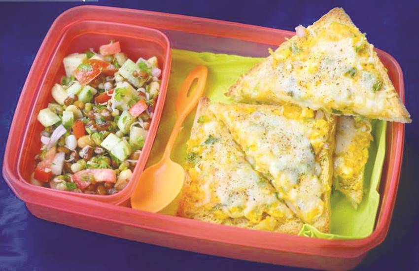 ब्रेड को तिकोने आकार में काट लें। अब चम्मच की मदद से ब्रेड के एक तरफ इस मिश्रण को ठीक से दबा कर पूरे ब्रेड पर ठीक से फैलाएं। नॉन स्टिक पैन में थोड़ा-सा देसी घी लगा कर गरम करें और उसमें मिश्रण लगे हिस्से की तरफ से टोस्ट को सेंकने के लिए रख दें। दूसरे हिस्से की तरफ भी मिश्रण लगा दें और हल्की आंच पर सिंकने दें। जब एक तरफ का हिस्सा सुनहरा सिंक जाए तो टोस्ट को पलट दें और दूसरी तरफ से सेंक लें। यह कुरकुरा टोस्ट तैयार है। इसे ठंडा होने के बाद भी बच्चा खाएगा, तो उसे स्वादिष्ट लगेगा। टिफिन में यह टोस्ट देते समय कुछ अंकुरित दालों को भाप या पानी में उबाल कर, उसमें खीरा, टमाटर वगैरह डाल कर जरूर दें। ध्यान रहे कि जब भी बच्चे को टिफिन में अंकुरित दें, तो उसमें प्याज न डालें, इससे महक आ जाएगी और वह नहीं खाएगा।