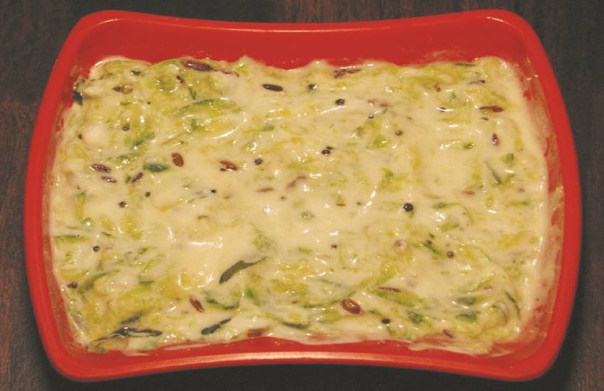 अब इस रायते में डालने के लिए उतनी ही मात्रा में कद््दूकस की हुई लौकी लें जितनी मात्रा में आपने दही ली है। इस लौकी को स्टीमर में भाप देकर या फिर पैन या कुकर में हल्का पानी डाल कर नरम होने तक पका लें। पानी निथार कर इसे ठंडा हो जाने दें।