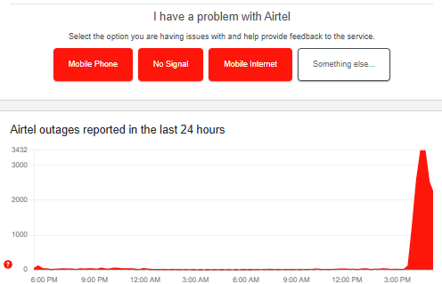 डाउन डिटेक्टर के मुताबिक, 74 फीसदी मोबाइल यूजर्स को आउटेज का दिक्कत हो रही है। 15 फीसदी यूजर्स को नो सिग्नल की समस्या का सामना करना पड़ रहा है। वही, 11 फीसदी यूजर्स को नेटवर्क इश्यू का सामना करना पड़ रहा है। डाउन डिटेक्टर के मुताबिक, 4:30 बजे तक करीब 3600 लोगों ने इसको लेकर शिकायत की है।