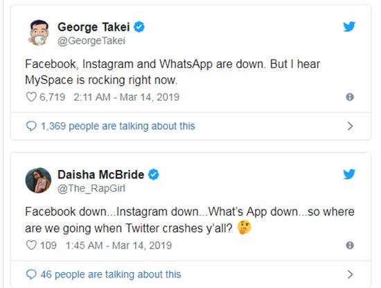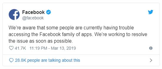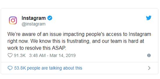 दुनिया भर में यूजर्स 13 तारीख की रात से ही सोशल नेटवर्किंग वेबसाइट फेसबुक और इंस्टाग्राम को नहीं चला पा रहे थे। फेसबुक और इंस्टाग्राम ने भी ट्वीट करके इस दिक्कत को स्वीकार किया था। फेसबुक के आधिकारिक ट्विटर हैंडल से ट्वीट किया गया था कि “हम जानते हैं कि कुछ लोगों को फेसबुक फेमिली के ऐप्स तक पहुंचने में दिक्कत हो रही है। हम जल्द से जल्द इस दिक्कत को खत्म करने का काम कर रहे हैं। वहीं इंस्टग्राम की तरफ से ट्वीट किया गया है कि “हम जानते हैं कि यह निराशाजनक है, हमारी टीम इस समस्या का समाधान करने के लिए कड़ी मेहनत कर रही है।”
