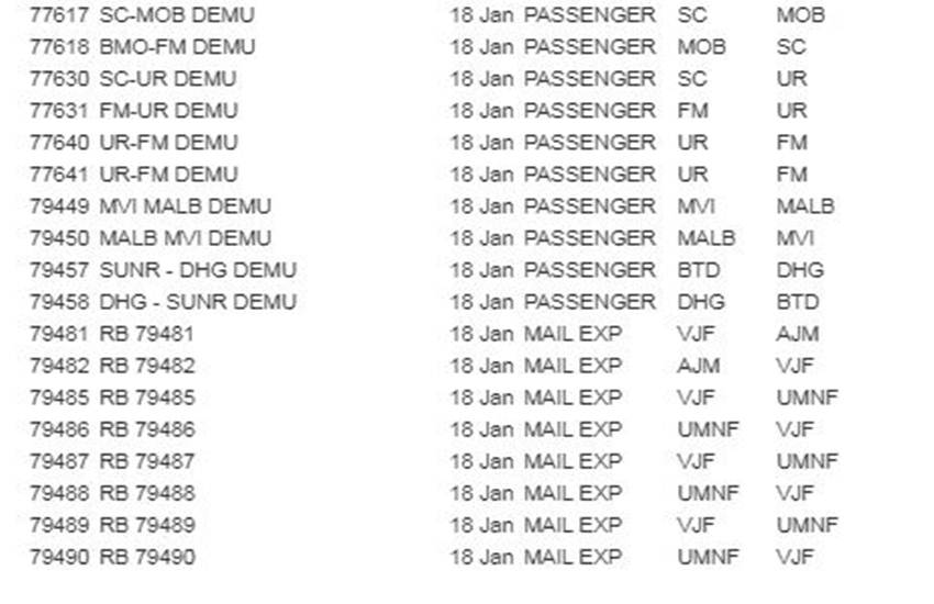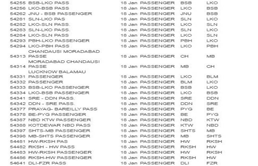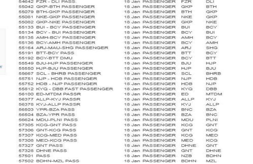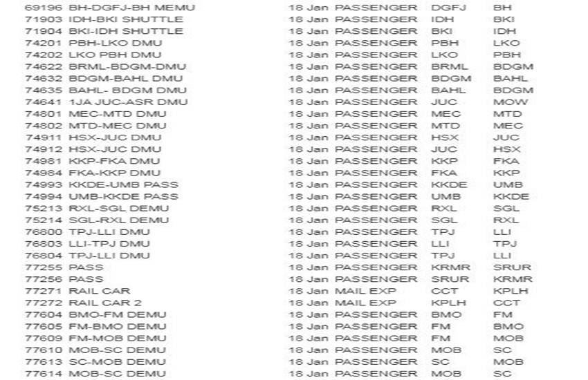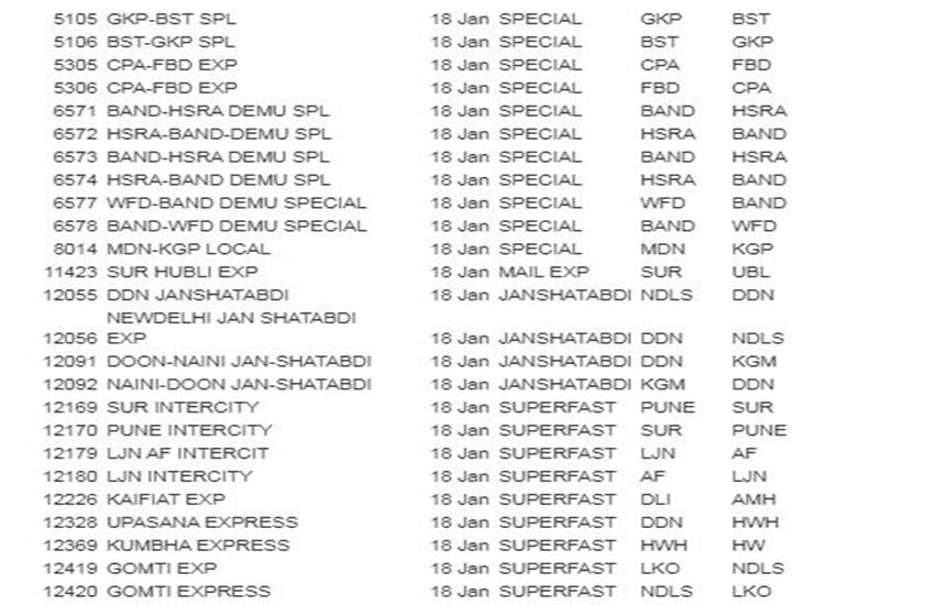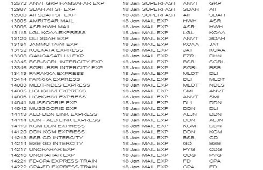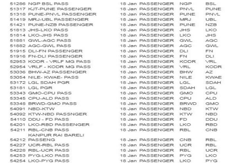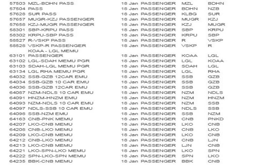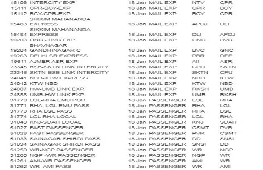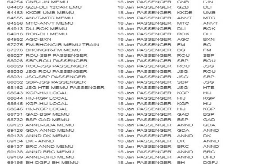 भारतीय रेलवे ने शनिवार (18 जनवरी) को अलग-अलग रूटों पर संचालित 310 ट्रेनों को कैंसिल कर दिया। इनमें स्पेशल ट्रेनें, मेल और एक्सप्रेस ट्रेनें शामिल हैं। इन 310 ट्रेनों में सबसे ज्यादा पैसेंजर ट्रेनें हैं। जिन यात्रियों की ट्रेन कैंसिल हुई है वह रेलवे से अपनी टिकट का पैसा रिफंड करवा सकते हैं।