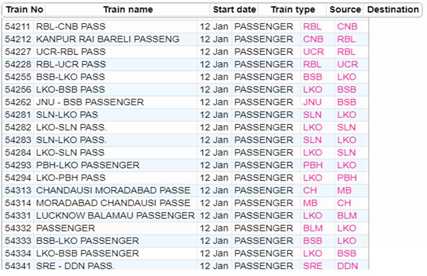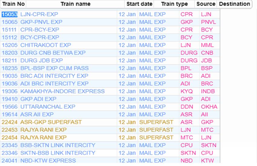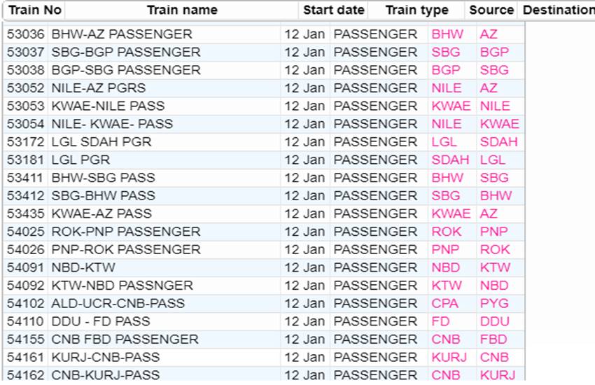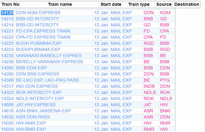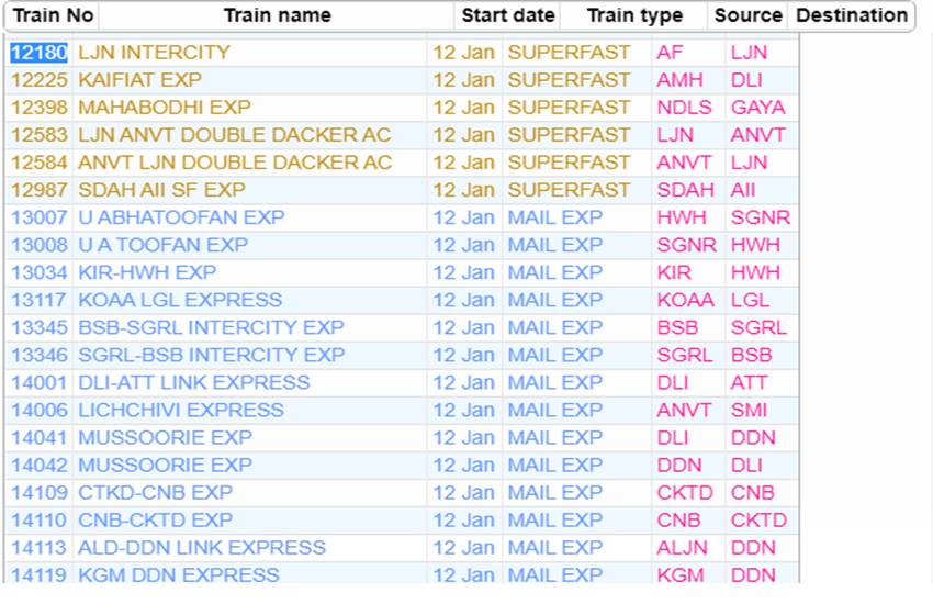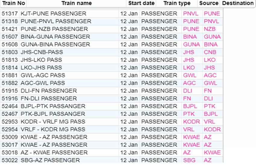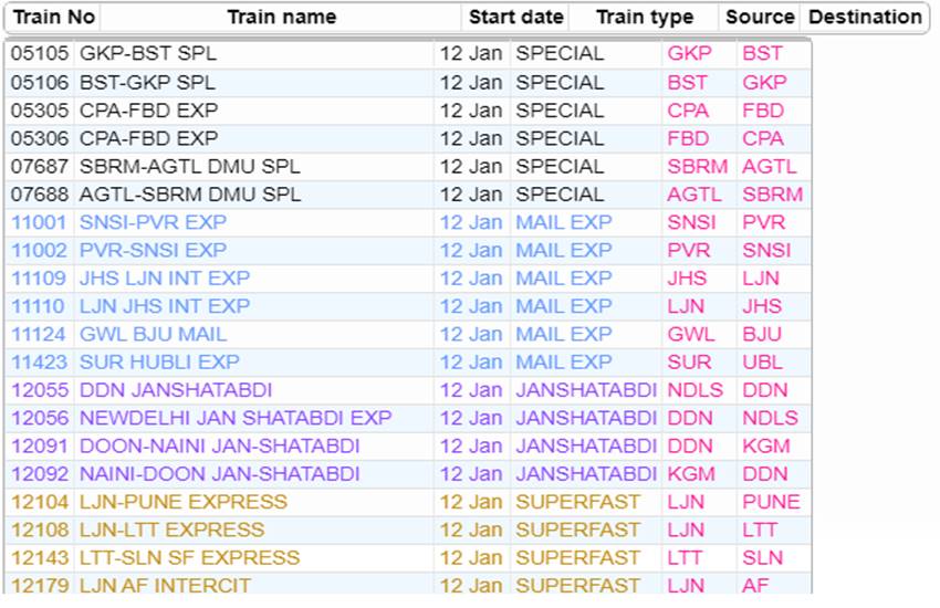 आज रविवार यानी 12 जनवरी 2020 को रेलवे ने कई ट्रेनों को रद्द कर दिया है। आप लोगों की जानकारी के लिए बता दें कि आज 348 रेलगाड़ियां कैंसिल की गई हैं और इसमें 244 रेलगाड़ियां पूरी तरह रद्द हैं, जबकि 104 ट्रेन आंशिक रूप से कैंसल हैं। हमने आपकी सुविधा के लिए खबर में कुछ प्रमुख ट्रेनों की लिस्ट को साझा किया है। इस लिस्ट में आपको रद्द हुई ट्रेन का नाम, ट्रेन नंबर और रेलगाड़ी का रूट जैसी अन्य अहम जानकारियां मिल जाएगी। अगर आपको साझा की गई लिस्ट में आपकी ट्रेन न मिले तो यहां क्लिक करके आप रेलवे की सभी जानकारी अपने मोबाइल पर पा सकते हैं।