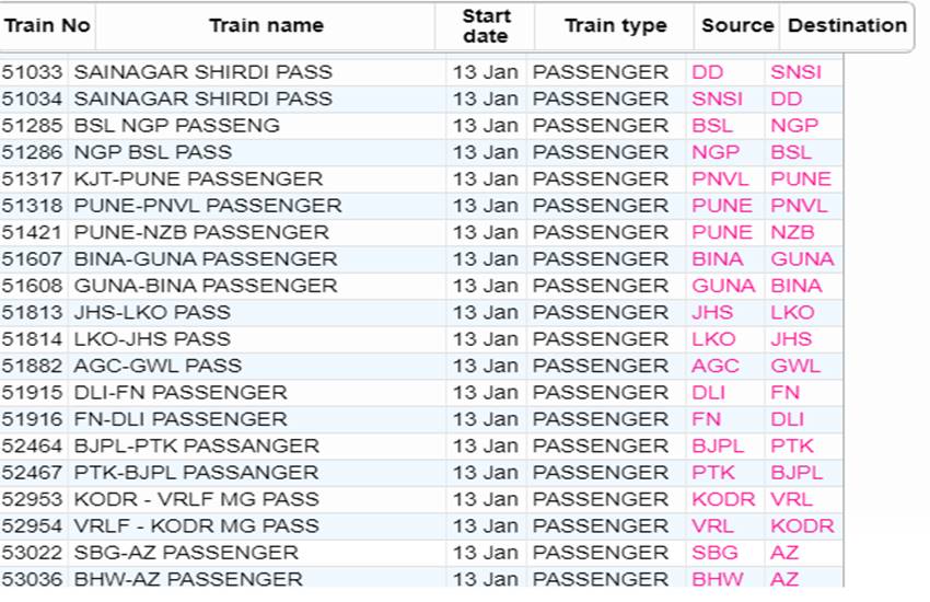 IRCTC Indian Railways Train Cancelled List Today: आज सोमवार यानी 13 जनवरी 2020 को भारतीय रेलवे ने कई रेलगाड़ियां रद्द कर दी हैं। आप लोगों की जानकारी के लिए बता दें कि आज 526 रेलगाड़ियां कैंसिल की गई हैं और इसमें 358 रेलगाड़ियां पूरी तरह रद्द हैं, जबकि 168 ट्रेन आंशिक रूप से कैंसल हैं। हम आपकी सुविधा के लिए खबर में कुछ प्रमुख ट्रेनों की लिस्ट को साझा कर रहे हैं। इस लिस्ट में आपको रद्द हुई ट्रेन का नंबर, नाम और रेलगाड़ी का रूट जैसी जानकारियां मिल जाएगी। यहां क्लिक करके आप रेलवे की सभी जानकारी अपने मोबाइल पर पा सकते हैं।