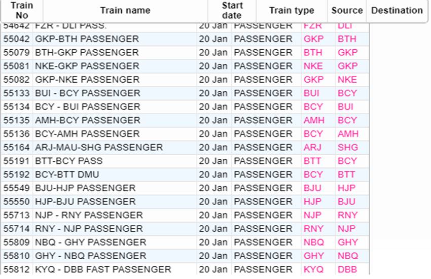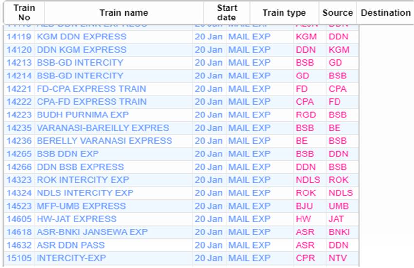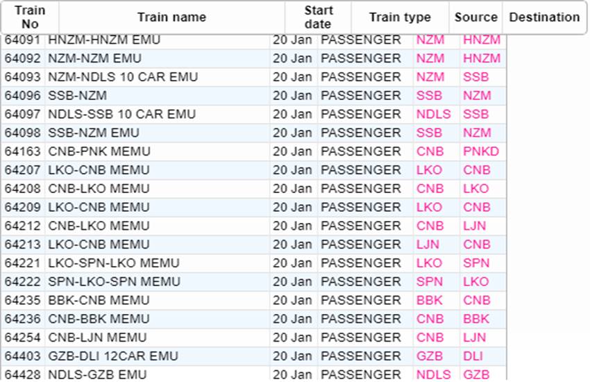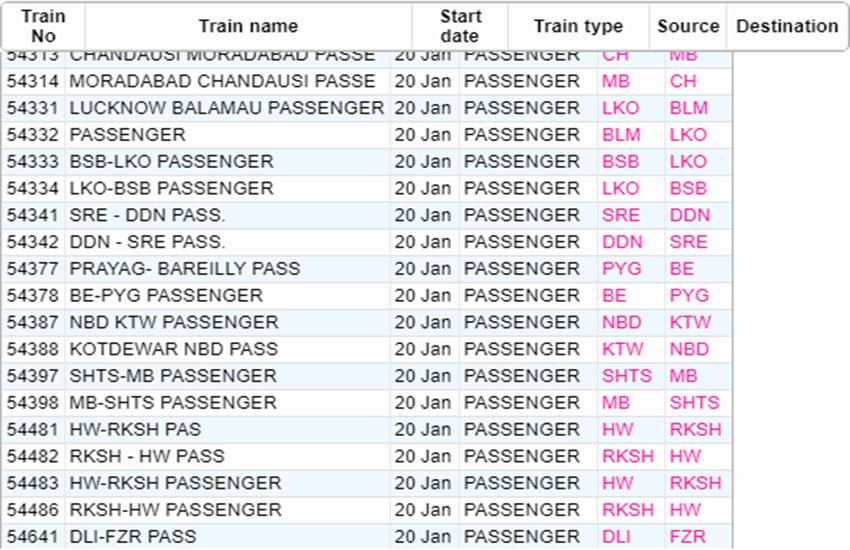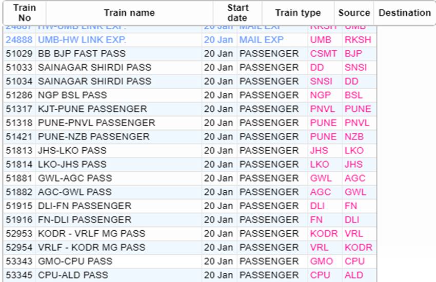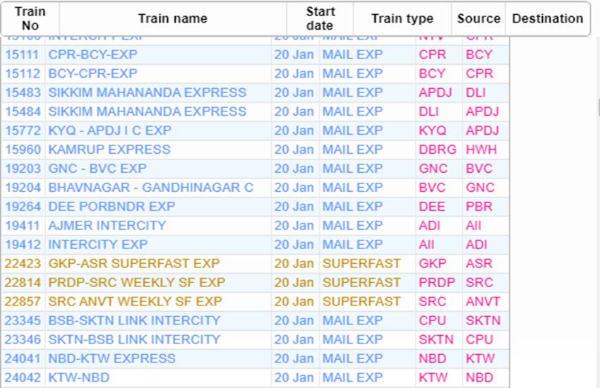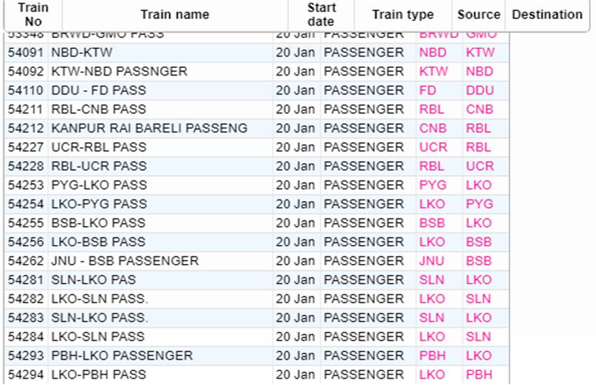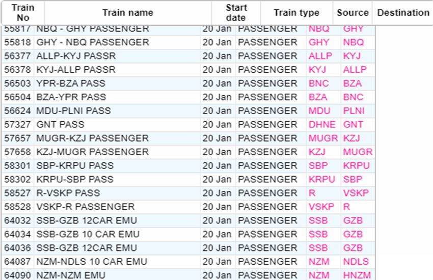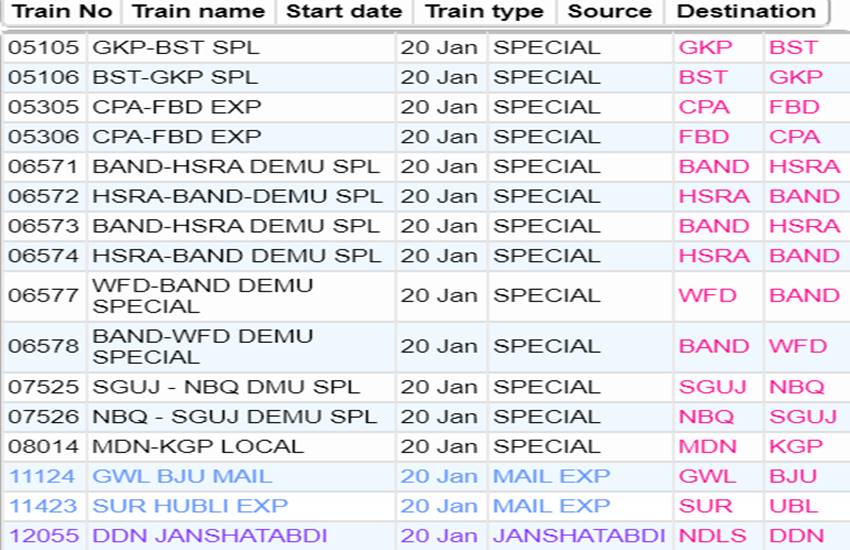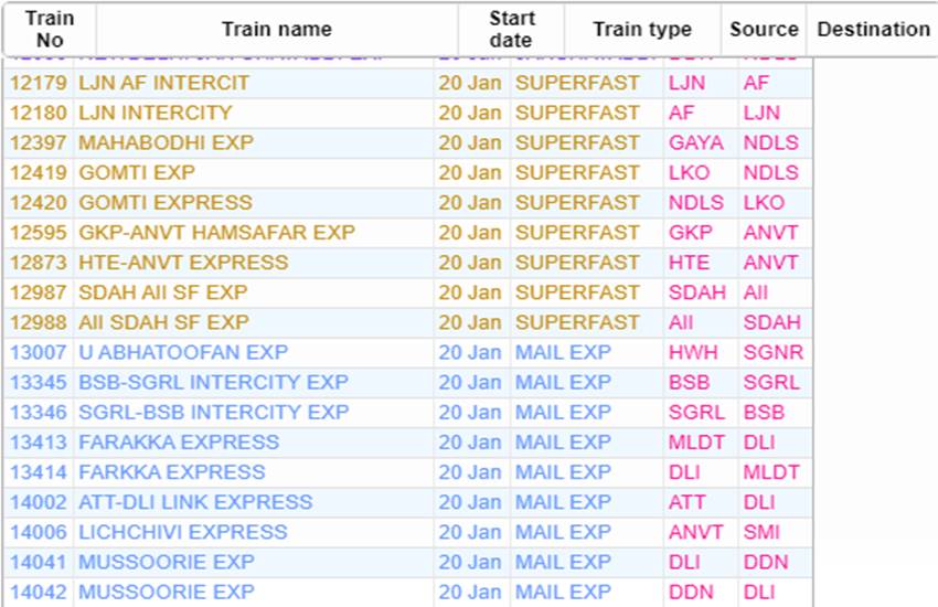 आज सोमवार यानी 20 जनवरी 2020 को भारतीय रेलवे ने कई रेलगाड़ियां रद्द कर दी हैं। आप लोगों की जानकारी के लिए बता दें कि आज 535 रेलगाड़ियां कैंसिल की गई हैं और इसमें 377 रेलगाड़ियां पूरी तरह रद्द हैं, जबकि 158 ट्रेन आंशिक रूप से कैंसल हैं। हम आपकी सुविधा के लिए खबर में कुछ प्रमुख ट्रेनों की लिस्ट को साझा कर रहे हैं। इस लिस्ट में आपको रद्द हुई ट्रेन का नंबर, नाम और रेलगाड़ी का रूट जैसी जानकारियां मिल जाएगी। यदि खबर में साझा की गई लिस्ट में आपकी ट्रेन न मिले तो रेलवे की आधिकारिक वेबसाइट पर जाकर आप अपनी ट्रेन का स्टेटस चेक कर सकते हैं।