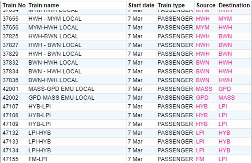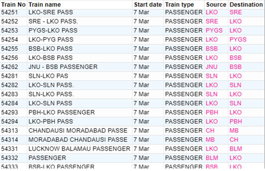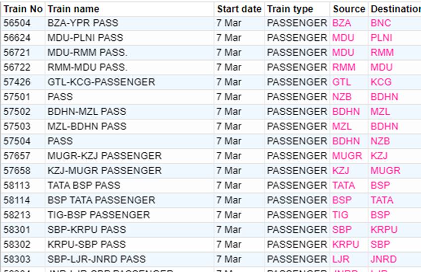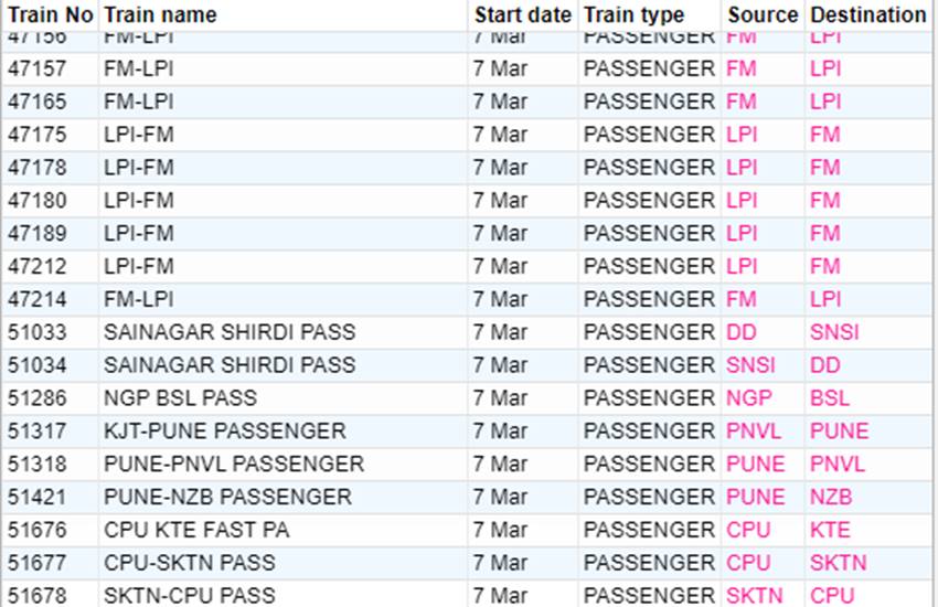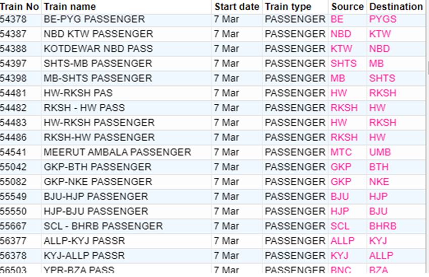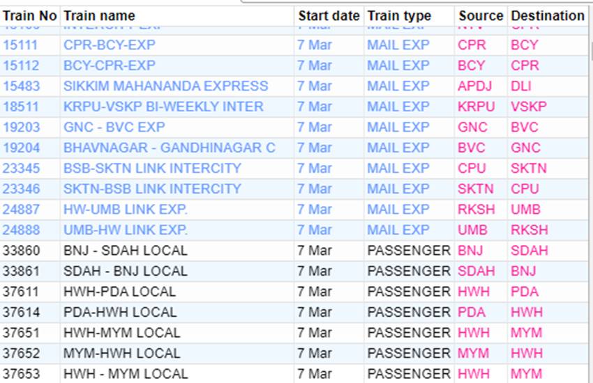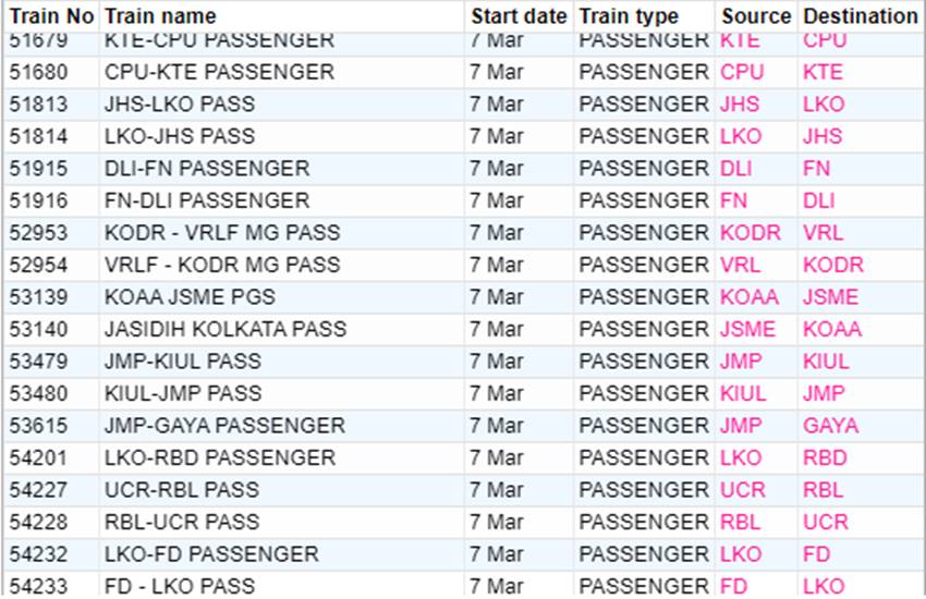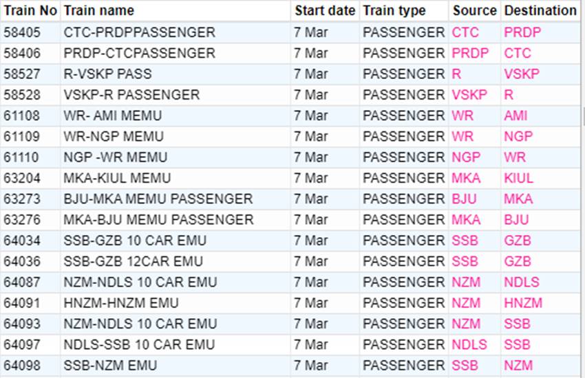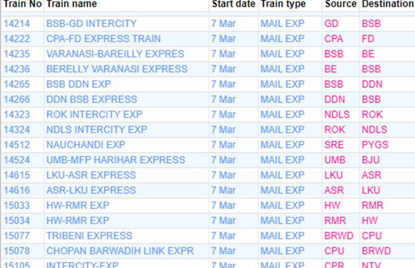 रेलवे ने आज शनिवार यानी 07 मार्च 2020 को कई रेलगाड़ियां रद्द कर दी हैं। यदि आप भी आज से ट्रेन से सफर करने वाले हैं तो घर से निकलने से पहले चेक कर ले कहीं आपकी ट्रेन भी तो रद्द नहीं है। आप लोगों की जानकारी के लिए बता दें कि आज 351 ट्रेनें कैंसिल की गई हैं और इसमें 235 रेलगाड़ियां पूरी तरह रद्द हैं, जबकि 116 ट्रेन आंशिक रूप से कैंसल हैं। आपकी सुविधा के लिए हम कुछ प्रमुख ट्रेनों की लिस्ट को साझा कर रहे हैं। लिस्ट में आपको रद्द हुई ट्रेन का नंबर, नाम और रेलगाड़ी का रूट जैसी जानकारियां मिल जाएगी।