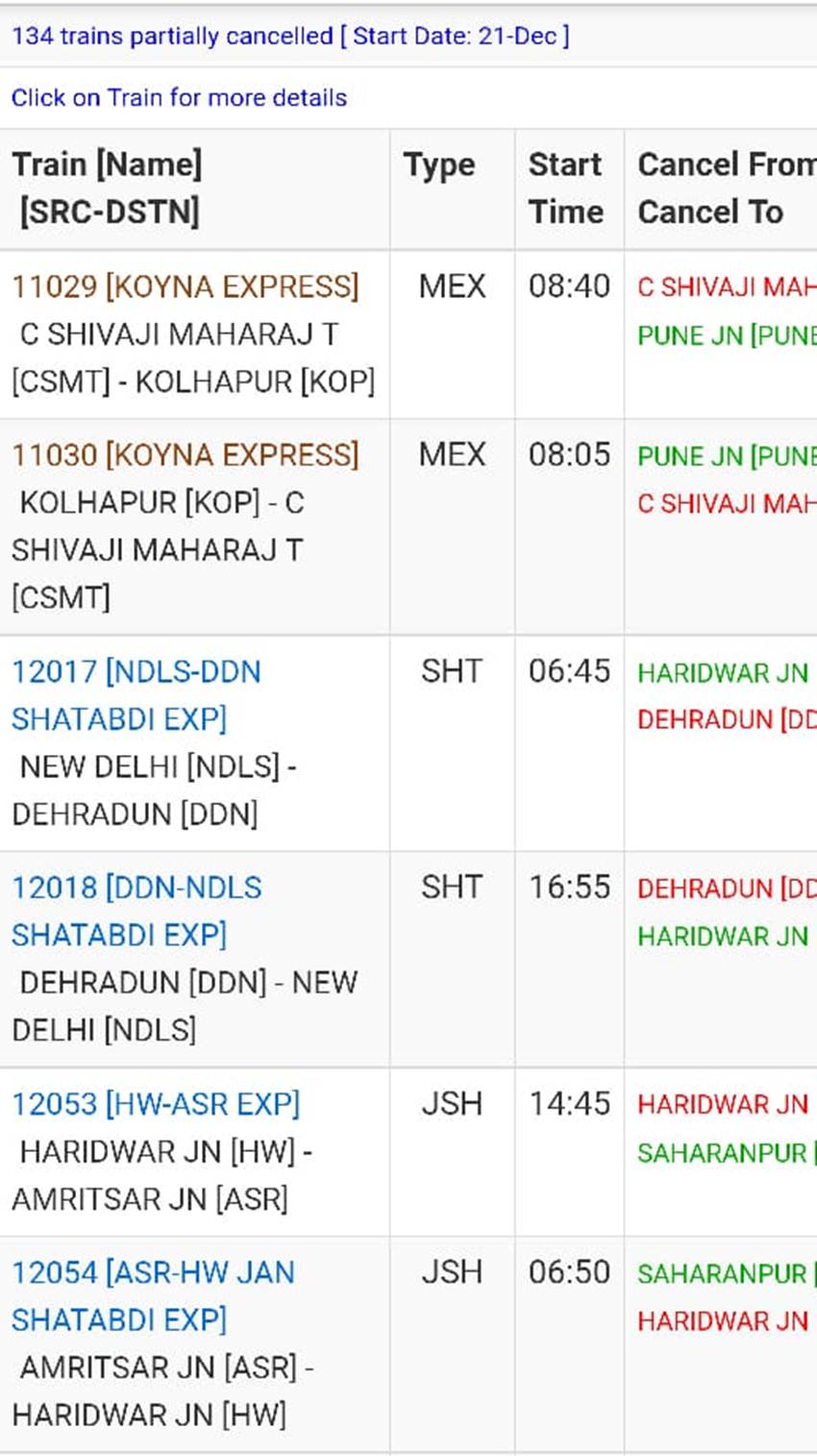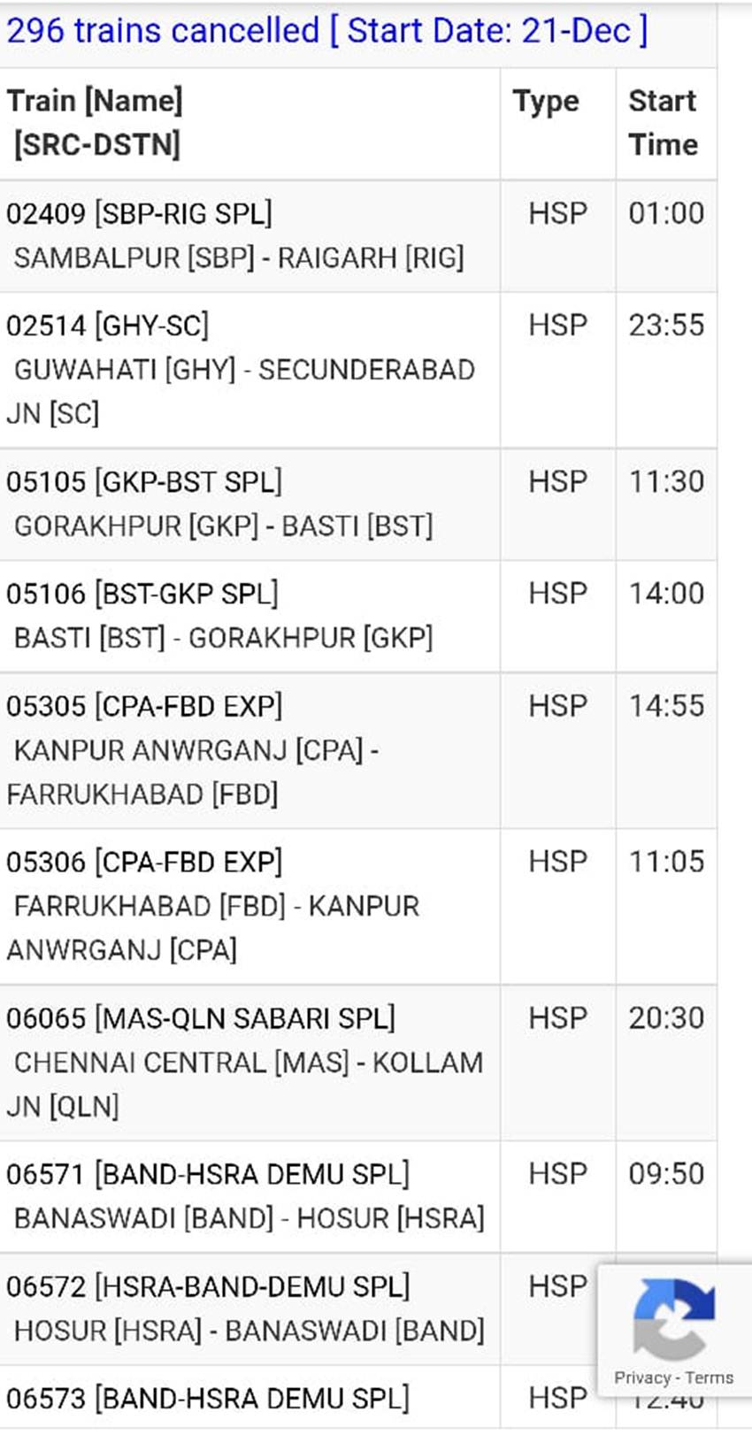 आज यानी 21 नवंबर को कुल 431 ट्रेनों का आवागमन प्रभावित है। इनमें 296 ट्रेनें कैंसल हैं, जबकि 135 गाड़ियां आंशिक तौर पर रद्द हैं। हम नीचे स्क्रीनशॉट में इन दोनों ही तरह की कुछ चुनिंदा ट्रेनों का ब्यौरा दे रहे हैं। आपको इस लिस्ट के अंश में गाड़ियों के नाम, नंबर और रूट की जानकारी मिल जाएगी। अगर आपकी गाड़ी इनमें न मिले, तब आप रेलवे की आधिकारिक साइट चेक कर लें।