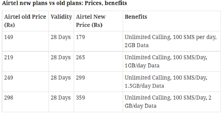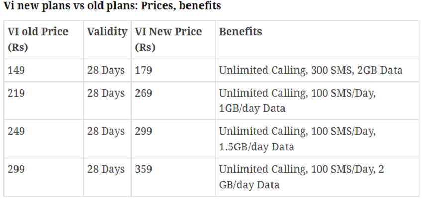मौजूदा 75 रुपए वाले प्लान की कीमत एक दिसंबर से 91 रुपए होगी, जो कि 20 फीसदी से ज्यादा की बढ़ोतरी है। 129 रुपए वाले प्लान की कीमत 155 रुपए, 399 रुपए वाले प्लान की कीमत 479 रुपए, 1,299 रुपए वाले प्लान की कीमत 1,559 रुपए और 2,399 रुपए वाले प्लान की कीमत 2,879 रुपए होगी।