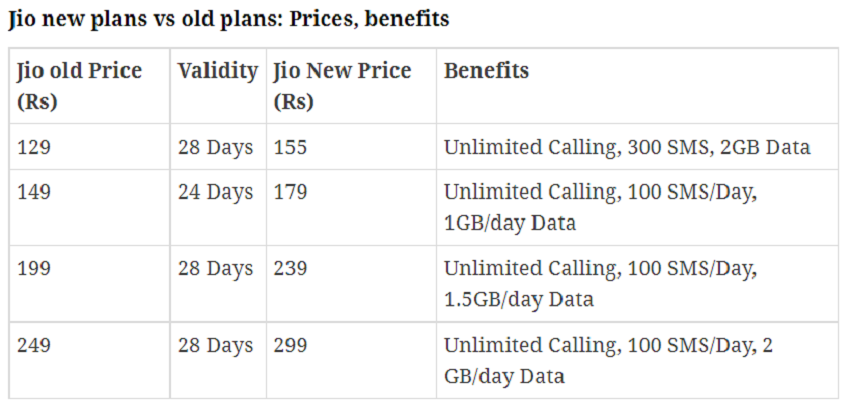 मुकेश अंबानी की कंपनी ने अपने एक बयान में कहा कि शुल्क-वृद्धि का यह फैसला जियोफोन प्लान, अनलिमिड प्लान और डेटा एड-ऑन पर लागू होगा। इन पर शुल्क वृद्धि 19.6 प्रतिशत से लेकर 21.3 प्रतिशत तक की गई है।