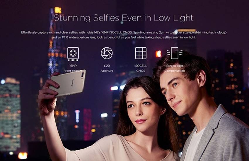 नूबिया ने इसके 128GB इंटरनल मैमोरी वाले मॉडल को भारत में लॉन्च नहीं किया है। कैमरे की बात करें तो नूबिया एम2 में 13 मेगापिक्सल का डुअल रियर कैमरा दिया गया है। इसके साथ डुअल एलईडी फ्लैश भी दिया गया है। इनमें से एक सेंसर कलर कैपचर करेगा और दूसरा सेंसर मोनोक्रोम के लिए है। दोनों कैमरे पर सेफायर ग्लास प्रोटेक्शन दिया गया है। सेल्फी और वीडियो कॉलिंग के लिए फोन में एफ/2.0 अपर्चर के साथ 16 मेगापिक्सल का फ्रंट कैमरा दिया गया है।