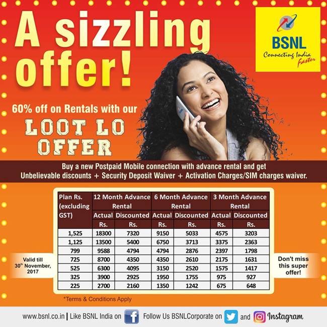 BSNL अपने यूजर्स के लिए शानदार ऑफर लेकर आया है, इसमें यूजर्स को 60 फीसदी का डिस्काउंट दिया जा रहा है, साथ ही डेटा भी पांच गुना तक दिया जा रहा है। इस ऑफर का नाम बीएसएनएल लूट लो ऑफर है। यह ऑफर बीएसएनएल के पोस्टपेड यूजर्स के लिए है। इस ऑफर के तहत बीएसएनल के सात प्लान हैं। इसमें 225 रुपए, 325 रुपए, 525 रुपए, 725 रुपए, 799 रुपए, 1,125 रुपए और 1,525 रुपए वाले सात पोस्टपेड प्लान शामिल हैं। अब 225 रुपए के प्लान में 500MB, 325 रुपए के प्लान में 500MB, 525 रुपए के प्लान में 3GB, 725 रुपए के प्लान में 15GB, 799 रुपए के प्लान में 30GB, 1,125 रुपए के प्लान में 60GB और 1,525 रुपए के प्लान में 90GB डेटा दिया जा रहा है। यह डेटा 3जी है। इस डेटा के लिए किसी तरह की स्पीड लिमिट नहीं है।