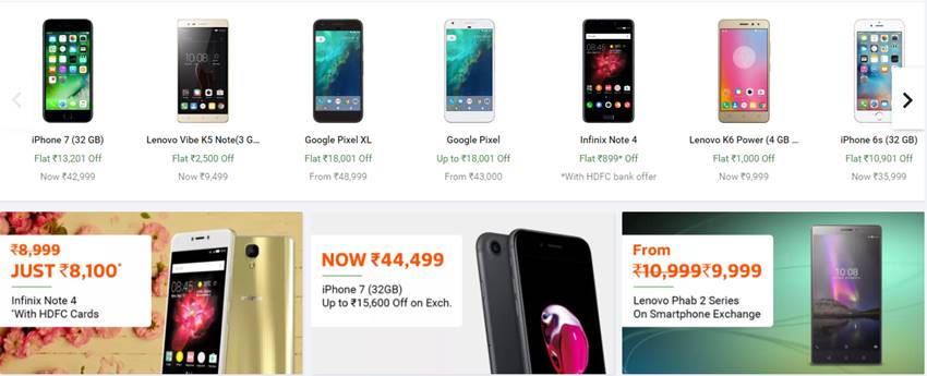 सैमसंग गैलेक्स ऑन नेक्सट 64GB पर 3,000 रुपये का डिस्काउंट दिया जा रहा है। इस फोन को अब 14,900 रुपये में खरीदा जा सकता है। सैमसंग ऑन 7 पर 700 रुपये का डिस्काउंट दिया जा रहा है। इसे 7,790 रुपये में खरीदा जा सकता है। सैमसंग गैलेक्सी ऑन 5 पर 2,300 रुपये का डिस्काउंट दिया जा रहा है। इसे अब 6,690 रुपये में खरीदा जा सकता है। ऐप्पल के आईफोन 6 32GB मॉडल 5,501 रुपये का डिस्काउंट दिया जा रहा है। इसे अब फ्लिपकार्ट से 23,999 रुपये में खरीदा जा सकता है। मोटो M के 3GB रैम वाले मॉडल पर 3,000 रुपये का डिस्काउंट दिया जा रहा है। इस फोन को अब 12,999 रुपये में खरीदा जा सकता है।