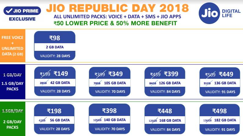 Jio Republic Day Offer 2018: एयरटेल के बाद अब रिलायंस जियो ने भी अपने सभी प्लान्स सस्ते कर दिए हैं। साथ ही JIO ने इन प्लान्स में डेटा की लिमिट को भी बढ़ा दिया है। अब जियो ने अपने प्लान्स की कीमत में 50 रुपए की कटौती कर दी है। इसके साथ ही हाई स्पीड डेटा की लिमिट को भी 50 फीसदी तक बढ़ा दिया है। यह सभी ऑफर 26 जनवरी 2018 से लागू होंगे। अब कंपनी एक महीने के लिए अनलिमिटेड डेटा और कॉलिंग केवल 98 रुपए में दे रही है। इस प्लान में यूजर्स को हाई स्पीड का 2GB डेटा मिलेगा। हाई स्पीड डेटा की लिमिट खत्म होने के बाद इंटरनेट तो अनलिमिटेड चलता रहेगा लेकिन स्पीड कम होकर 64kbps की रह जाएगी। इस प्लान की वैधता 28 दिन की है। इस प्लान में यूजर को जियो ऐप्स का सब्सक्रिप्शन भी फ्री मिलेगा।