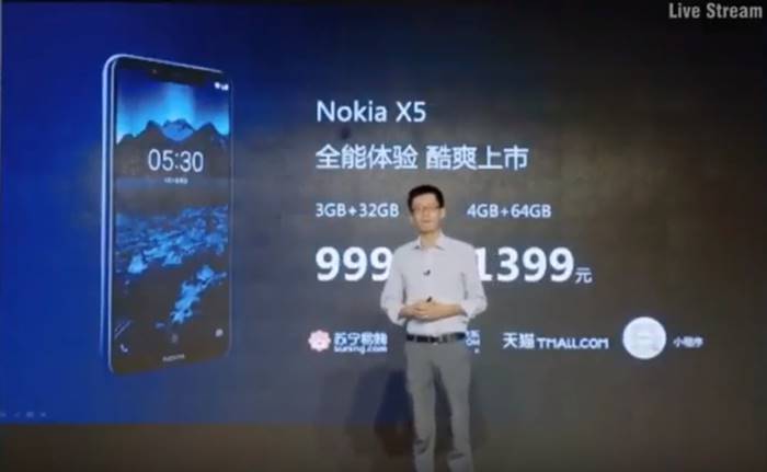 Nokia X5 लॉन्च हो गया है। इसकी खास बात है इसमें दी गई इसकी डिस्प्ले। इसमें ऐप्पल आईफोन X जैसी डिस्प्ले दी गई है। यह स्मार्टफोन नोकिया के हाल ही में लॉन्च हुए NOKIA X6 जैसा लगता है। वहीं इसके दूसरे फीचर्स की बात करें तो इसमें डुअल रियर कैमरा दिया गया है। वहीं इसमें सिक्योरिटी के लिए फ्रंट में फिंगरप्रिंट सेंसर दिया है। वहीं इसके बैक में दिया गया पैनल ग्लासी है। इसमें 5.85 इंच की डिस्प्ले दी गई है। इसकी डिस्प्ले का आस्पेक्ट रेश्यो 19:9 का है। वहीं इसमें ऑक्टा कोर Soc प्रोसेसर दिया गया है।