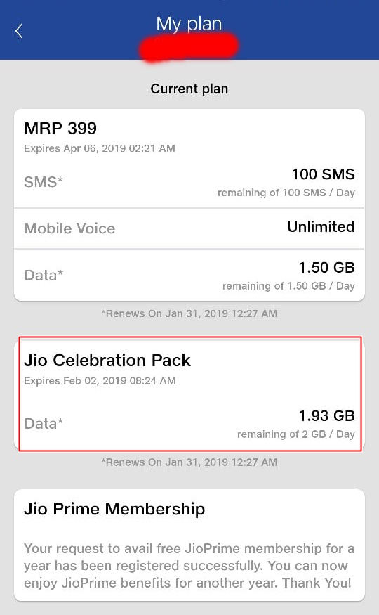Reliance Jio Celebration Pack सिर्फ Jio Prime users को अपने स्मार्टफोन की MyJio ऐप में मिलेगा। इसे चेक करने के लिए अपने स्मार्टफोन में MyJio में लॉगइन करें। लॉगइन करने के लिए अपना मोबाइल नंबर डालें और फिर ओटीपी सबमिट करें। MyJio ऐप में लॉगइन करने के बाद आप चेक कर सकते हैं Reliance Jio Celebration Pack का लाभ आपको मिल रहा है या नहीं। Reliance Jio Celebration Pack सिर्फ पांच दिनों के लिए लाया गया था। शुरू में इसकी वैलिडिटी 24 से 28 जनवरी तक की थी लेकिन अब इसे 2 फरवरी तक बढ़ा दिया गया है।