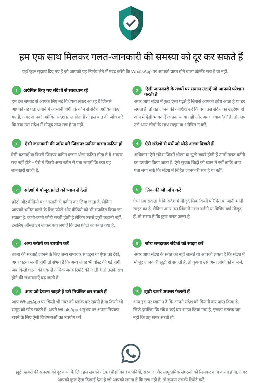 Whatsapp Web Status in Hindi, Whatsapp New Features Update: Whatsapp अब फर्जी मैसेज को रोकने के लिए लोगों को इसके तरीके बताकर जागरुक कर रहा है। इसके लिए वह नए नए तरीके अपना रहा है। हाल ही में वॉट्सऐप ने इसी कड़ी में लोगों के लिए 10 टिप्स जारी किए हैं। इसमें वॉट्सऐप ने बताया है कि कैसे आप किसी फर्जी मैसेज को पहचान सकते हैं। कैसे किसी झूठी खबर को फैलने से रोका जा सकता है। वॉट्सऐप ने अपने जागरुकता अभियान को टाइटल दिया है कि हम एक साथ मिलकर गलत-जानकारी की समस्या को दूर कर सकते हैं।