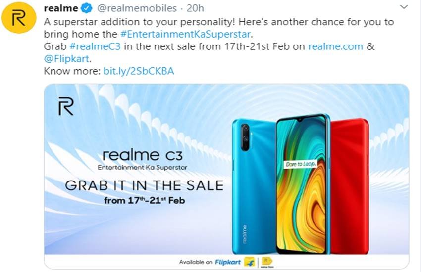 Realme C3 Sale की बात करें तो रियलमी स्मार्टफोन की पहली सेल 14 फरवरी 2020 दोपहर 12 बजे ई-कॉमर्स साइट Flipkart और कंपनी की आधिकारिक वेबसाइट पर शुरू होगी।