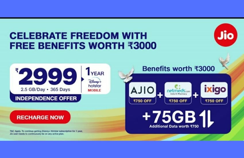 Jio Independence offer के तहत कंपनी 2,999 रुपये वाले प्लान में 3000 रुपये के फायदे दे रही है।