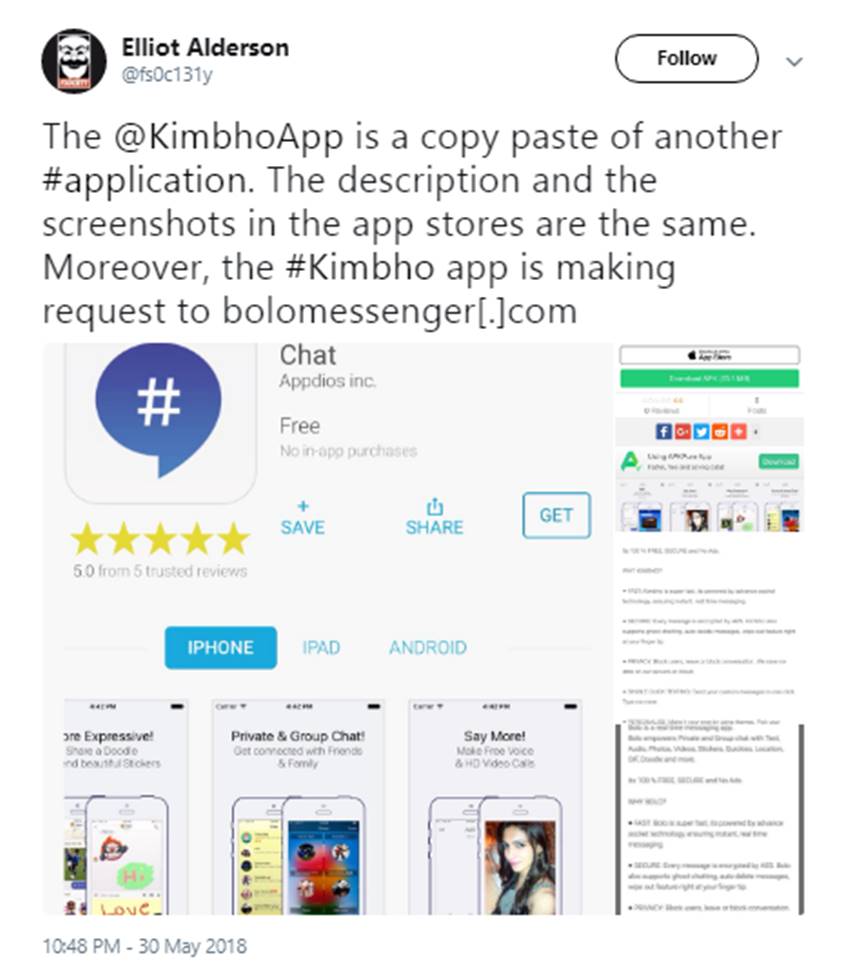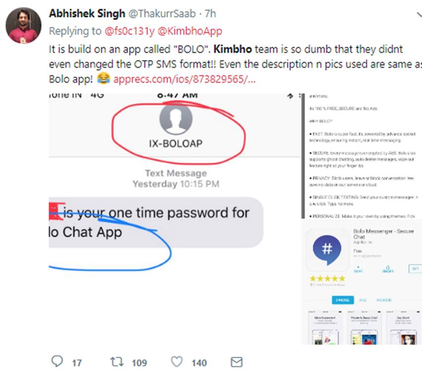अभिषेक सिंह ने ट्वीट कर कहा, “यह ‘बोलो’ ऐप पर तैयार की गई है। किंभो टीम इतनी बेवकूफ है कि उसने ओटीपी एसएमएस फॉर्मेट भी नहीं बदला। यहां तक कि डिस्क्रिप्शन में ब्यौरा भी बोलो ऐप जैसा दिखता है।” जागृति शुक्ला बोलीं, “सिम कार्ड के बाद बाबा किंभो देसी मैसेजिंग ऐप लाए हैं। कुछ दिन बाद बाबा और उनकी कंपनी न्यूक्लियर हथियार बनाएगी।”