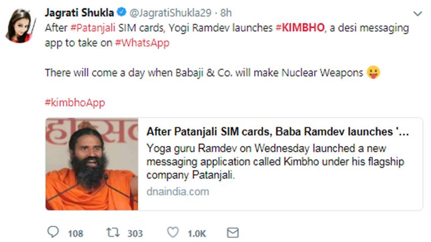 पतंजलि का किंभो ऐप्लीकेशन गूगल प्ले स्टोर से इस वक्त लापता है। योग गुरू और पतंजलि कंपनी के मालिक बाबा रामदेव इसे स्वदेशी के नारे के तहत लाए थे। वह इसके जरिए भारत में वॉट्सऐप को टक्कर देना चाहते थे। पर किंभो का सामना अमेरिकी मैसेजिंग ऐप से होता, उससे पहले ही बाबा और उनका यह देसी शस्त्र सोशल मीडिया पर फुस्स बता दिया गया। लोगों ने किंभो के गायब होने के बाद टि्वटर पर इसके और रामदेव के जमकर मजे लिए।