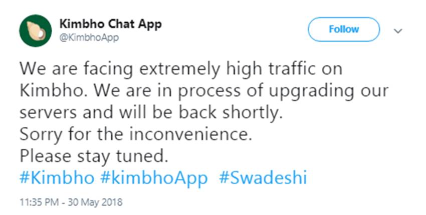 वहीं, किंभो चैट ऐप के अकाउंट से इस मसले पर सफाई आई। कहा गया कि उनकी ऐप पर अचानक ढेर सारा ट्रैफिक आ गया। ऐसे में वह अपने सर्वर अपग्रेड कर रहे हैं। जल्द ही वह वापस लौटेंगे। किंभो ने इसके साथ माफी भी मांगी है।