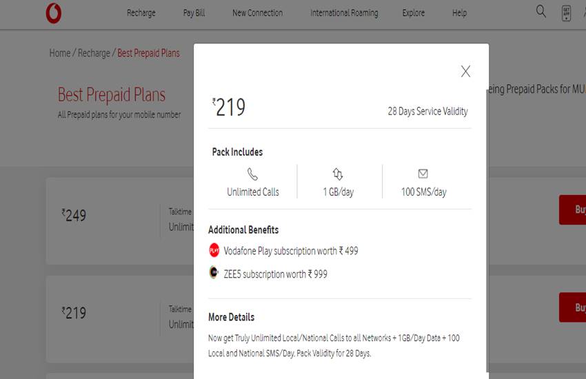 पांचवा सबसे सस्ता वोडाफोन प्लान 219 रुपये का है। इस प्लान के साथ 199 रुपये वाले प्लान के समान ही बेनिफिट्स मिलते हैं लेकिन अंतर दोनों में केवल वैलिडिटी का है, यह प्लान 28 दिनों की वैलिडिटी के साथ आता है। इसका मतलब इस प्लान में कुल 28GB डेटा मिलता है।