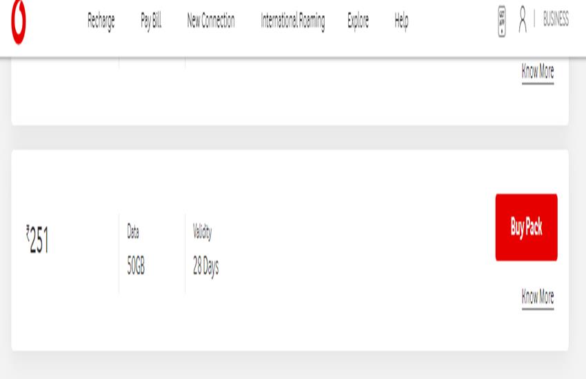 251 रुपये वाले डेटा प्लान में यूजर को 50GB 4जी/3जी/2जी डेटा मिलेगा। आप लोगों की जानकारी के लिए बता दें कि इस वोडाफोन डेटा पैक की वैधता 28 दिनों की है। इस डेटा पैक को रीचार्ज के लिए वोडाफोन की वेबसाइट पर लाइव कर दिया गया है।