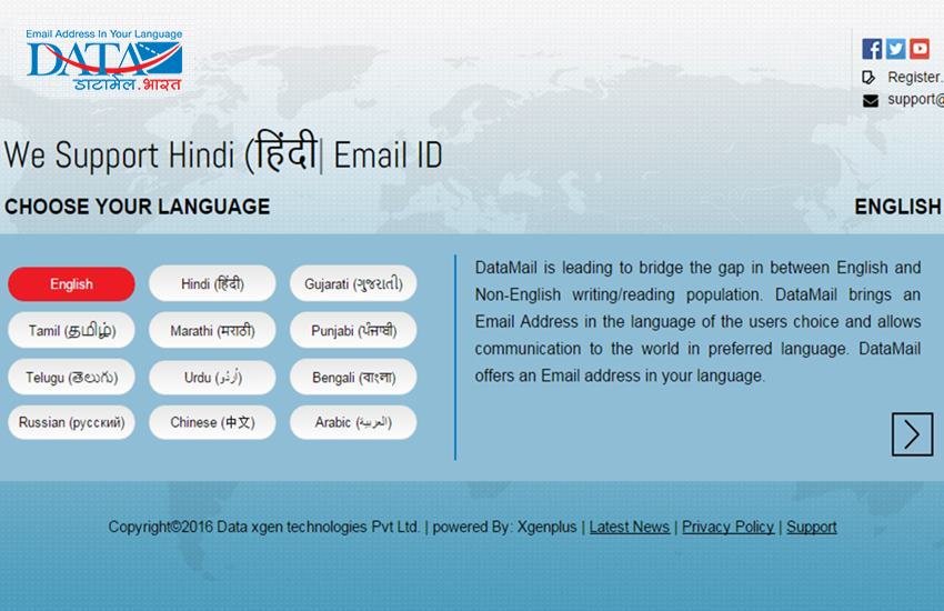 भारत में बना ‘डाटामेल’ ऐप हिंदी, उर्दू, मराठी, बांग्ला समेत 8 भारतीय भाषाओं में ई-मेल आईडी बनाने की सुविधा देता है। साथ ही यह अंग्रेजी, अरबी, रूसी और चीनी भाषा में भी ई-मेल आईडी की सुविधा मुहैया कराता है। आने वाले समय में डाटा एक्सजेन टेक्नोलॉजीज प्राइवेट लिमिटेड की तरफ से 22 भाषाओं में ई-मेल आईडी क्रिएट करने की सुविधा उपलब्ध कराई जाएगी। डाटामेल एप को किसी भी एंड्रॉयड या आईओएस के जरिए उनके प्लेस्टोर से मुफ्त डाउनलोड किया जा सकता है।