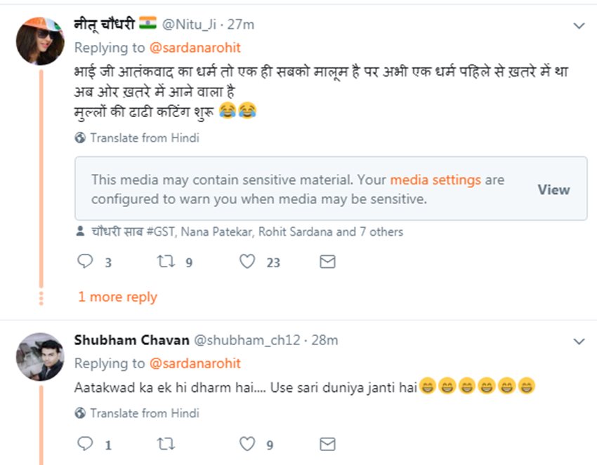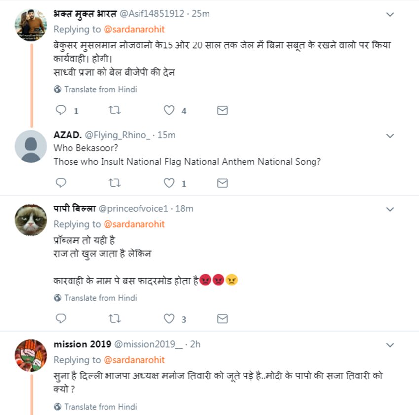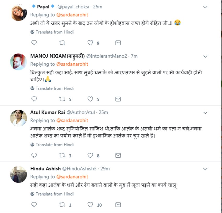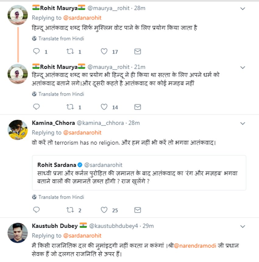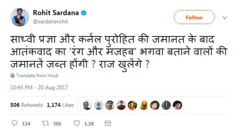 वहीं सोशल मीडिया पर सरदाना के इस बयान पर काफी प्रतिक्रिया देखने को मिल रही है। कई लोगों ने सरदाना के इस ट्वीट का समर्थन किया है। कुछ ट्विटर यूजर्स ने इशारों ही इशारों में कांग्रेस पर निशाना साधते हुए लिखा कि “हिंदू आतंकवाद” की बात कहकर पार्टी ने मुस्लिम वोटों के तुष्टिकरण की राजनीति की थी। इसके अलावा कई ट्विटर यूजर ने रोहित सरदाना की तारीफ भी की। बता दें नासिक जिले के मालेगांव में 29 सितंबर, 2008 को हुए विस्फोट में 6 लोग मारे गए थे। इस मामले के मुख्य आरोपी कर्नल पुरोहित ने 25 अप्रैल के बंबई उच्च न्यायालय के आदेश को चुनौती दी थी। बंबई हाई कोर्ट ने पुरोहित की जमानत नामंजूर कर दी थी। सुप्रीम कोर्ट ने बंबई हाई कोर्ट के फैसले को दरकिनार करते हुए पुरोहित को जमानत दे दी।