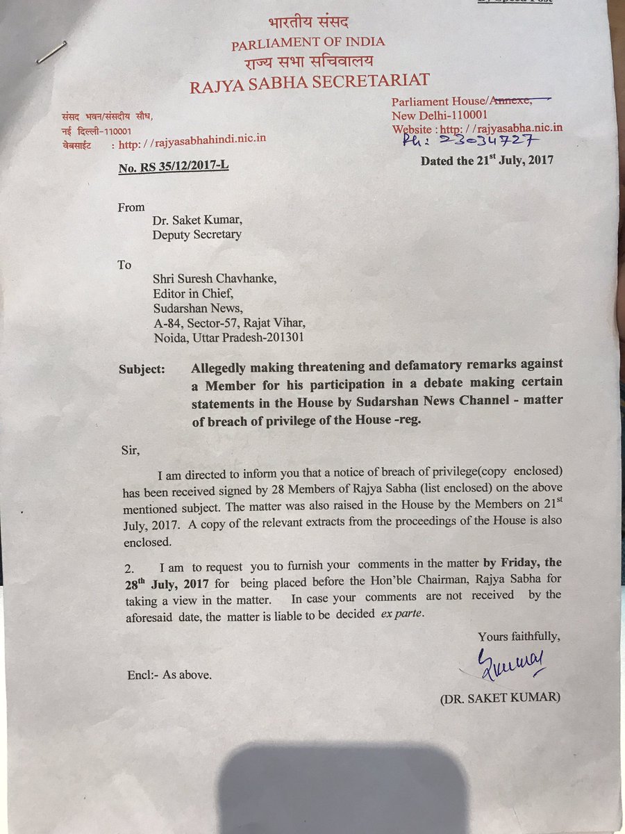 राज्यसभा की तरफ से नोटिस भेज कर सुरेश चह्वाणके से कहा गया है कि इस मुद्दे पर आप 28 जु लाई तक अपना पक्ष सामने रखें अन्यथा आपके खिलाफ कार्रवाई की जाएगी।