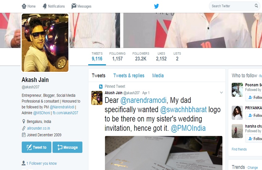 दरअसल 29 अप्रैल 2017 को आकाश जैन नाम के इस शख्स के बहन की शादी होनी है। मेहमानों को आमंत्रित करने के लिए निमंत्रण कार्ड छपवाया गया। आशीष के पिता प्रधानमंत्री मोदी के स्वच्छ अभियान से काफी प्रभावित लगते हैं। बकौल आशीष उनके पिता की इच्छा थी कि उनकी बेटी के निमंत्रण कार्ड पर स्वच्छ बारत अभियान का लोगो छपवाया जाए। शायद ऐसा करने के पीछे उनके दिमाग में ये बात हो कि इससे देश भर में चल रहे इस अभियान को थोड़ी रफ्तार और मिल जाए। आशीष ने अपने पिताजी की बात मान कार्ड पर लोगो छपवा दिया। कार्ड छपवाने के साथ ही उन्होंने इसे ट्विटर पर शेयर किया। अपने ट्वीट में आशीष ने प्रधानमंत्री नरेंद्र मोदी और प्रधानमंत्री कार्यालय को भी टैग किया।