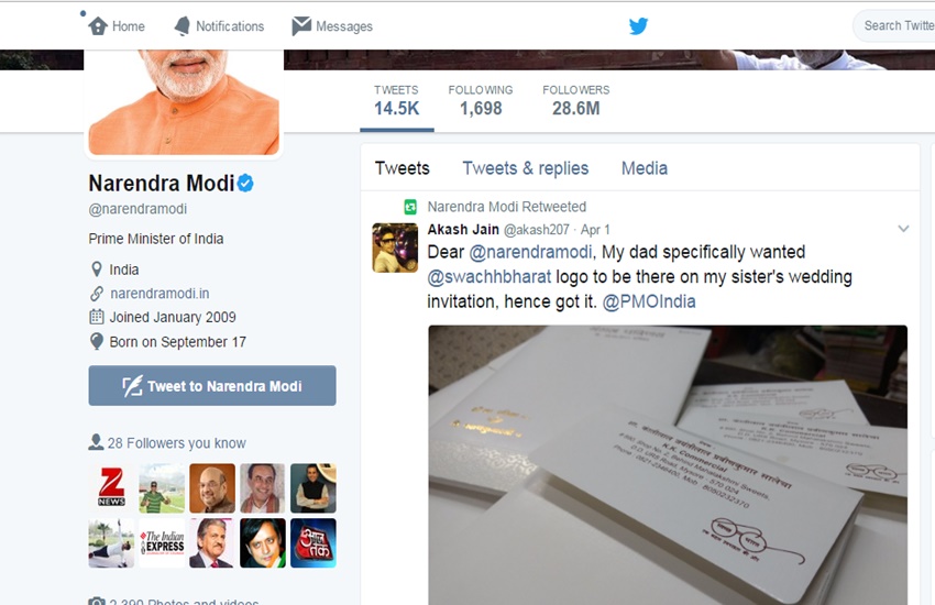 आपको बता दें कि प्रधानमंत्री बनने के बाद से ही प्रधानमंत्री नरेंद्र मोदी ने देश भर में स्वच्छता के लिए अभियान छेड़ रखा है। प्रधानमंत्री ने हमेशा देश के लोगों से अपील की है कि सब लोग इस स्वच्छता अभियान से जुड़ें और अपने देश को साफ सुथरा बनाएं। इसीलिए प्रधानमंत्री ने आकाश जैन के ट्वीट को रिट्वीट करते हुए अपने वॉल पर पिन टू टॉप कर रखा है। इसके साथ ही इस कार्ड को देख प्रधानमंत्री इतने खुश हो गए कि उन्होंने आकाश जैन को फॉलो भी कर लिया।