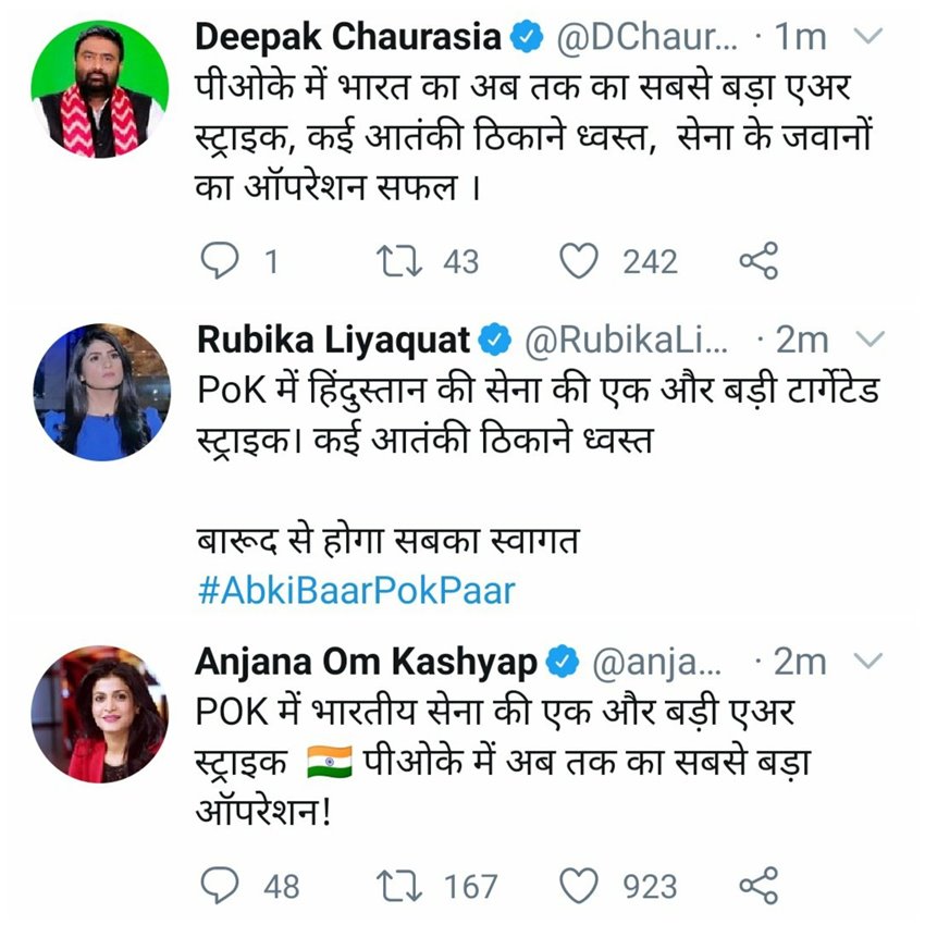 हिंदी न्यूज चैनल आज तक (Aaj Tak) की एंकर अंजना ओम कश्यप ने भी एयर स्ट्राइक की पर ट्वीट करते हुए लिखा- पीओक में भारतीय सेना की एक और बड़ी एअर स्ट्राइक, पीओके में अब तक का सबसे बड़ा ऑपरेशन। इसके अलावा दीपक चौरसिया, रुबिका लियाकत जैसे तमाम चर्चित न्यूज एंकर्स ने भी इसको लेकर ट्वीट किया।