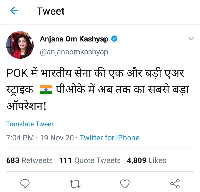 ट्वीट डिलीट करने के बाद उन्होंने एक अन्य़ ट्वीट किया। इस ट्वीट में अंजना ओम कशेयप ने लिखा- सेना ने PoK में आज किसी भी तरह की सैन्य स्ट्राइक का खंडन किया है। अपने इस ट्वीट पर अंजना जमकर ट्रोल हुईं। ट्रोल करने वालों में कुछ ने एयर स्ट्राइक की खबर को झूठ बताने के लिए उन्हें भला बुरा कहना शुरू कर दिया।