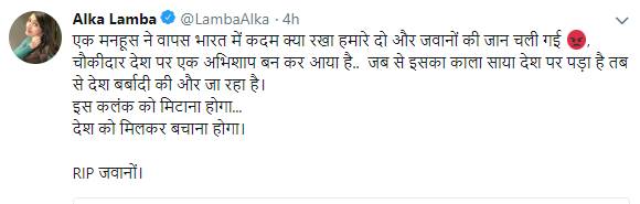 अलका लांबा ने इस घटना पर कई ट्वीट किये। उन्होंने कहा, “BJP के मनहूस सत्ता के साये” ने आज 2 और जवानों की कश्मीर में, 2 जवानों की छत्तीसगढ़ में जान ले ली। संघियों को दुःख नहीं होता? उन्हें श्रद्धांजलि देने पर इन्हें मौत पड़ती है? इन जवानों के लिये,इनके परिवारों के लिये एक शब्द इनके मुंह से नहीं निकलता। किसानों-जवानों की हाय लगे इन्हें।” बता दें कि 29 मई को ही पाकिस्तान ने 2003 में हुए संघर्षविराम का ‘अक्षरश:’ पालन करने की घोषणा की थी। लेकिन मात्र पांच दिन बाद ही पाकिस्तानी रेंजर्स ने अंतरराष्ट्रीय सीमा पर भारतीय चौकियों को निशाना बनाकर मोर्टार दागे और गोलीबारी की जिसमें सीमा सुरक्षा बल के एक अधिकारी समेत दो जवान शहीद हो गये।