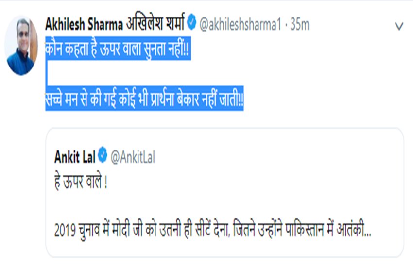 ऊपर वाला सबकी सुनता है: आम आदमी पार्टी के आईटी सेल के सदस्य अंकित लाल के ट्वीट पर कमेंट करते हुए @akhileshsharma1 नाम के यूजर ने लिखा कि कौन कहता है ऊपर वाला सुनता नहीं, सच्चे मन से की गई कोई भी प्रार्थना बेकार नहीं जाती!