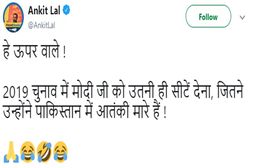 क्या था अंकित लाल का ट्ववीट: दरअसल, @AnkitLal नाम के ट्वविटर हैंडल से 6 मार्च को एक ट्वीट किया गया था। जिसमें लिखा गया कि हे ऊपर वाले! 2019 चुनाव में मोदी जी को उतनी ही सीटें देना, जितने उन्होंने पाकिस्तान में आतंकी मारे है! बता दें कि अंकित लाल नाम के इस ट्विटर हैंडल में खुद को आप आदमी पार्टी का सोशल मीडिया और आईटी रणनीतिकार के रूप में दिखाया गया है।