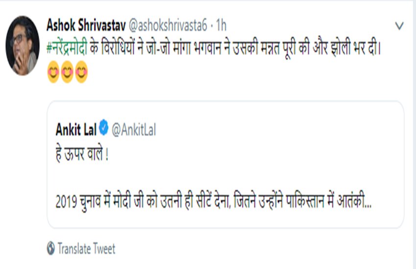 यूजर्स दे रहे ऐसे रिएक्शन: अंकित लाल के इस ट्वीट के बाद अब जब बीजेपी की 303 सीटें आईं हैं तो लोग सोशल मीडिया पर उन्हें ट्रोल कर हे हैं। @ashokshrivasta6 नाम के यूजर्स ने लिखा, “नरेंद्र मोदी के विरोधियों ने जो-जो मांगा भगवान ने उसकी मन्नत पूरी की और झोली भर दी।”