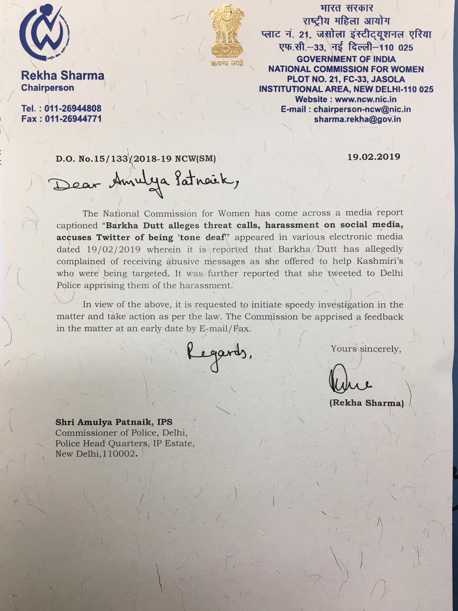 बरखा दत्त के साथ इस तरह की हरकत पर बहुत से लोग उनके समर्थन में आ गए हैं। ऐसे लोग इस तरह की हरकत को बेहूदा बताते हुए पुलिस से कार्रवाई की मांग कर रहे हैं। राष्ट्रीय महिला आयोग की अध्यक्ष रेखा शर्मा ने 19 फरवरी को दिल्ली पुलिस कमिश्नर को चिट्ठी लिखी है। इसमें आरोपियों को चिन्हित कर उनके खिलाफ कड़ी कार्रवाई करने के लिए कहा गया है।