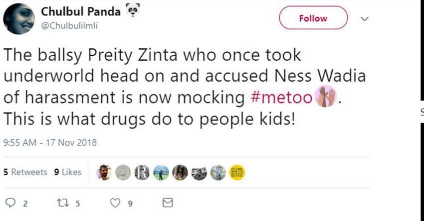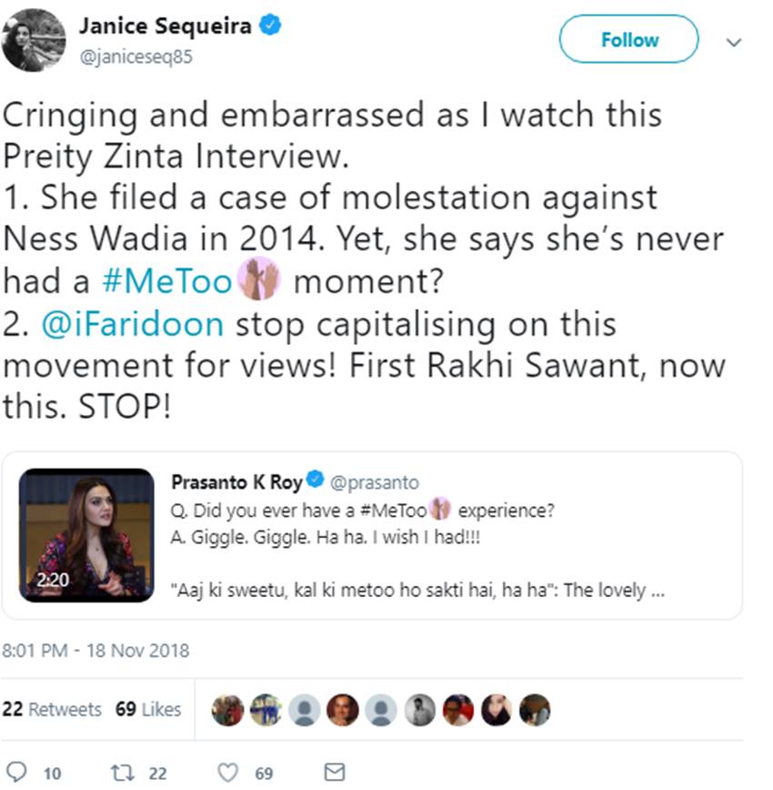 Shocking victim-blaming while discussing #MeTooIndia—watch why women like #PreityZinta are part of the problem: pic.twitter.com/V1oG9DYvBu