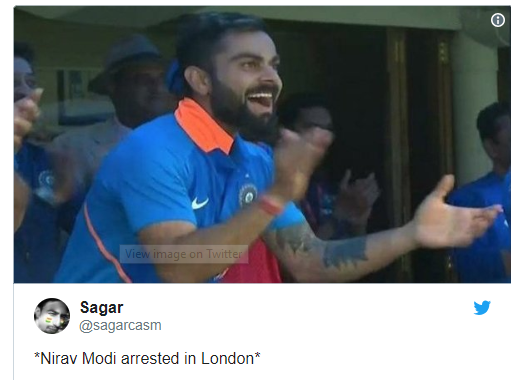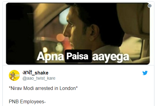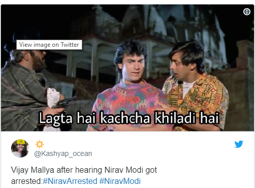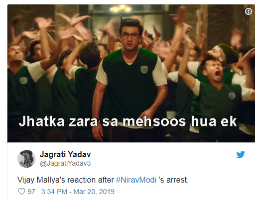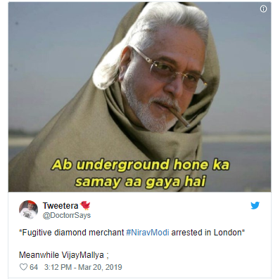 जैसे ही उनकी गिरफ्तारी की खबर फैली, भारत में लोग इसपर चुटकुले साझा करने लगे। लोगों ने ट्विटर पर मजेदार मीम्स शेयर करना शुरू कर दिया। लोगों ने फिल्मों के वीडियो और स्क्रीनशॉट पोस्ट कर भगोड़े शराब कारोबारी विजय माल्या के भी मजे लिए। आइए नज़र डालते हैं उन मीम्स पर –