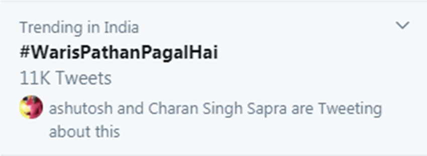 सोशल मीडिया में वारिस पठान के बयान को लेकर लोगों में इस कदर नाराजगी है कि ट्विटर पर बकायदा वारिस पठान पागल है का हैशटैग ट्रेंड कर रहा है। लोग इस हैशटैग के साथ AIMIM नेता की बातों का जमकर विरोध कर रहे हैं।