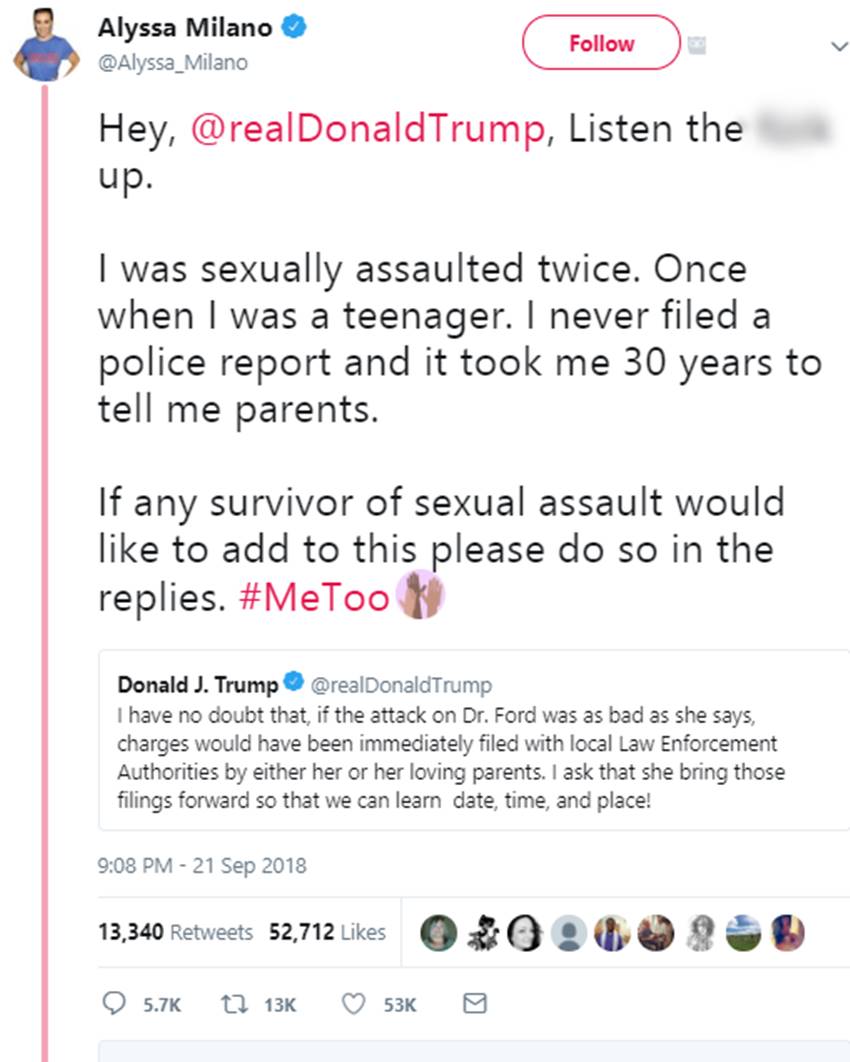 45 वर्षीय मिलानो अंतरराष्ट्रीय स्तर पर चले #MeToo आंदोलन का समर्थन करने वालों में सबसे आगे रहीं थी। शुक्रवार (21 सितंबर) को कई ट्वीट्स में ट्रंप ने फोर्ड के दावे पर शक जाहिर किया था। ट्रंप ने ट्वीट में कहा था, ”मुझे कोई शक नहीं कि डॉ फोर्ड पर वैसा ही हमला हुआ जैसा वो कह रही हैं तो तुरंत उनके या उनके माता-पिता द्वारा स्थानीय कानून एजंसियों से शिकायत की गई होगी। मैं चाहता हूं कि वह उस शिकायत को सामने लेकर आएं ताकि हमें (यौन उत्पीड़न की) तारीख, समय और जगह पता चल सके।”