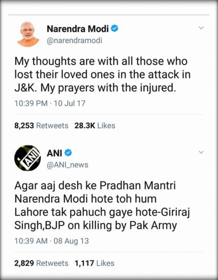 अमरनाथ यात्रियों पर हुए हमले के बाद भारतीय जनता पार्टी (बीजेपी) के नेता गिरिराज सिंह का एक पुराना बयान छाया हुआ है। वह बयान गरिराज सिंह ने आठ अगस्त 2013 को दिया था। तब पाकिस्तान की आर्मी ने भारतीय लोगों पर हमला किया था। उसपर गिरिराज सिंह ने कहा था अगर आज देश के प्रधानमंत्री नरेंद्र मोदी होते तो हम लाहौर तक पहुंच गए होते। न्यूज एजेंसी एएनआई के उस ट्वीट को तीन हजार के करीब लोगों ने शेयर किया था। अब इसको फिर से पीएम नरेद्र मोदी के ताजा बयान के साथ शेयर किया जा रहा है। अमरनाथ हमले के बाद मोदी ने लिखा था जिन लोगों ने हमले में अपनों को खोया मैं उनके साथ हूं। घायल लोगों के लिए मैं प्रार्थना करता हूं।